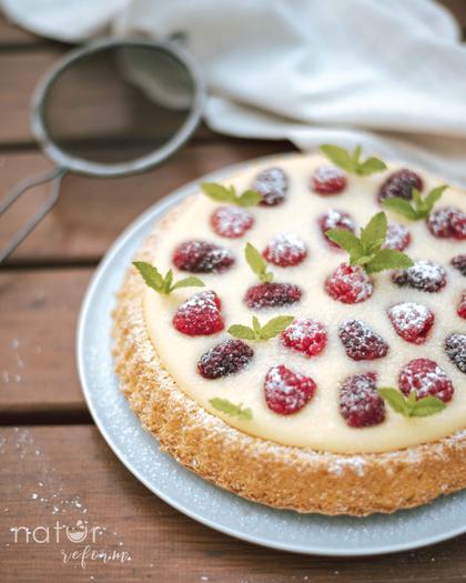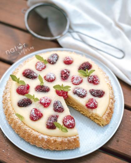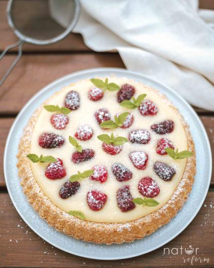 Amíg a piskóta sül, elkészítjük a pudingot. A pudingport 1 dl hideg növényi tejjel és az édesítővel csomómentesre keverünk, majd hozzáöntjük a maradék növényi tejet és folyamatos kevergetés mellett addig főzzük, míg be nem sűrűsödik. Ha már langyos a krém, a torta tetejére kanalazzuk. A tetejét bogyós gyümölcsökkel díszítjük. Tálalás előtt megszórjuk eritirit porral.